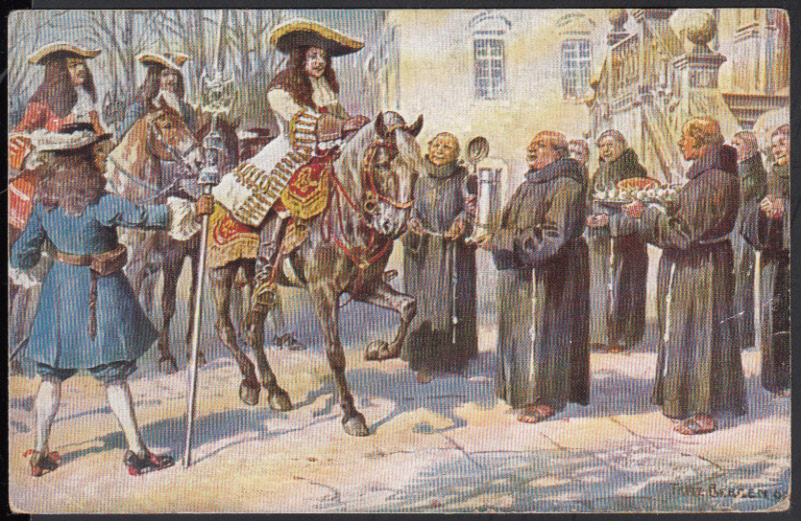 Nr. 38170 - GAPP 27 E6 - 5 Pf. Luitpold, PrivatGA "Gruß vom Salvator" mit Bild "Mönche mit Bierkrug empfangen Reiter", gebr. mit Steg-K1 MÜNCHEN 5 / 13.3.11, Ecke unten rechts weich und kleiner Randriß