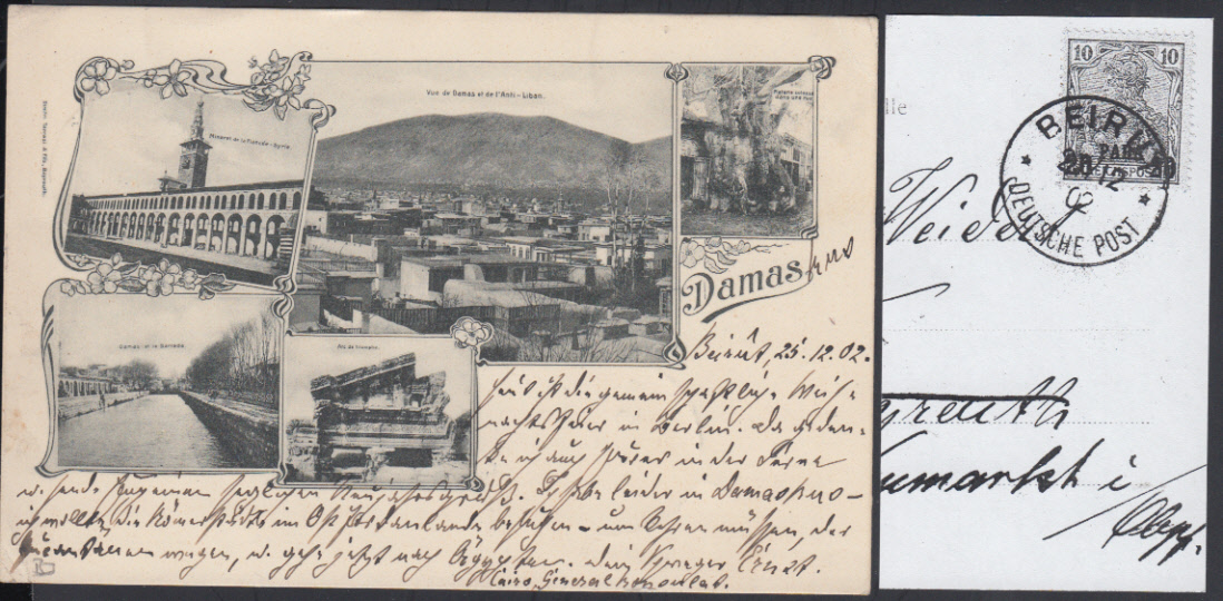 Nr. 38354 - AK13 I - Damas, fünfbildrige Fotokarte geschrieben in Beirut, mit 20 PARA auf 10 Pf. Germania Reichspost und K1 BEIRUT / DP / 27.1.02 nach Bayreuth und weiter nach Neumarkt