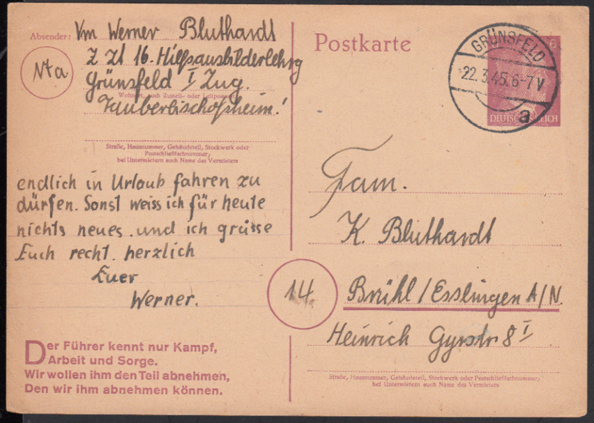 Nr. 38177 - GAP 314 II - GRÜNSFELD / 22.3.45, GA 6 Pf. Hitler nach Esslingen