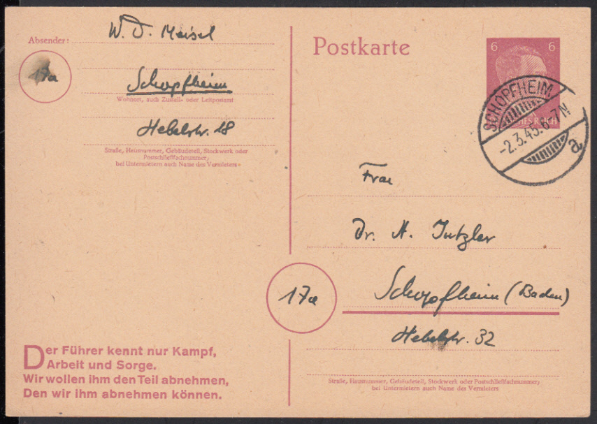 Nr. 38178 - GAP 314 II - SCHOPFHEIM / 2.3.45 6-7 N, klarer Steg-K1 mit Datumskuriosum auf phil. GA 6 Pf. Hitler im Ortsverkehr