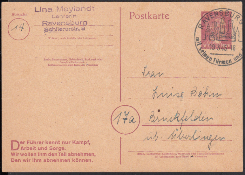 Nr. 38179 - GAP 314 II - RAVENSBURG / 19.3.45, Ortswerbestempel auf GA 6 Pf. Hitler nach Überlingen / Bodensee