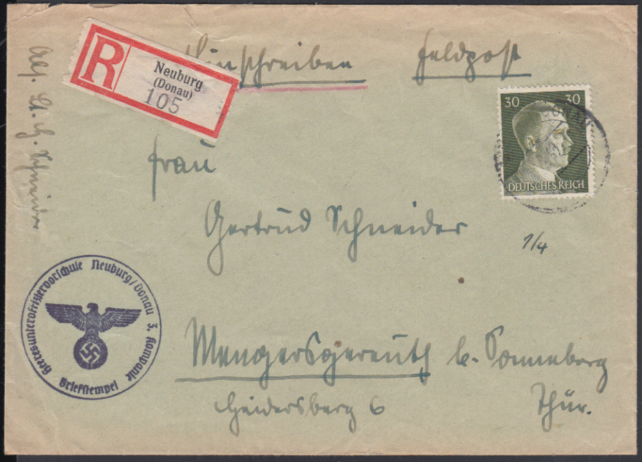 Nr. 38334 - 794 - NEUBURG (DONAU) / 2.3.42, 30 Pf. Hitler als Einschreibgebühr auf ansonsten portofreiem FP-Brief aus der Heeresunteroffizier- vorschule (Mi. 100 €)
