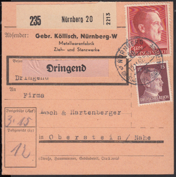 Nr. 38194 - Pktk801 A, 789 - 3 Mark Hitler weit gezähnt mit 15 Pf. auf Paketkarte "Dringend" ab NÜRNBERG 20 / 12.11.42 (Mi. 70 €)
