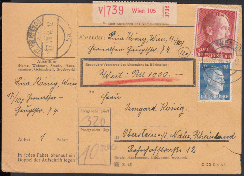 Nr. 38195 - Pktk801 A, 791 - 3 Mark Hitler weit gezähnt mit 20 Pf. auf Wertpaketkarte WIEN 105 / 17.VII.44, Einlieferungsabschnitt noch anhängend (Mi. 100 €)
