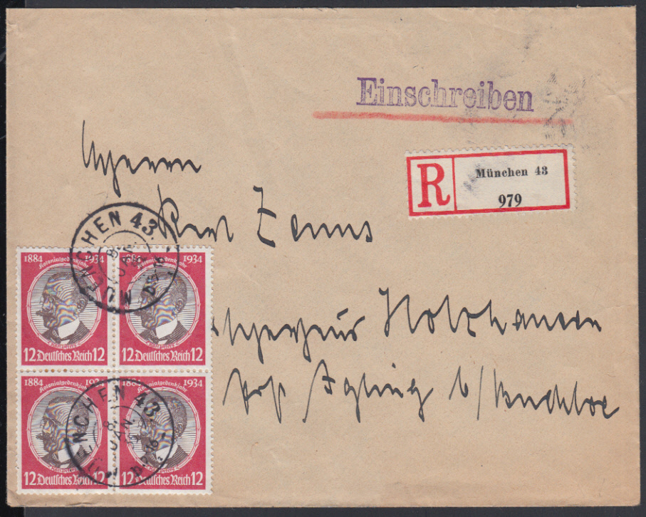 Nr. 38647 - 542 VB - 12 Pf. Kolonialforscher 1934, Viererblock auf Ebf. mit K2 MUENCHEN 43 / 8.1.35, überfrankiert (Tarif 42 Pf.)