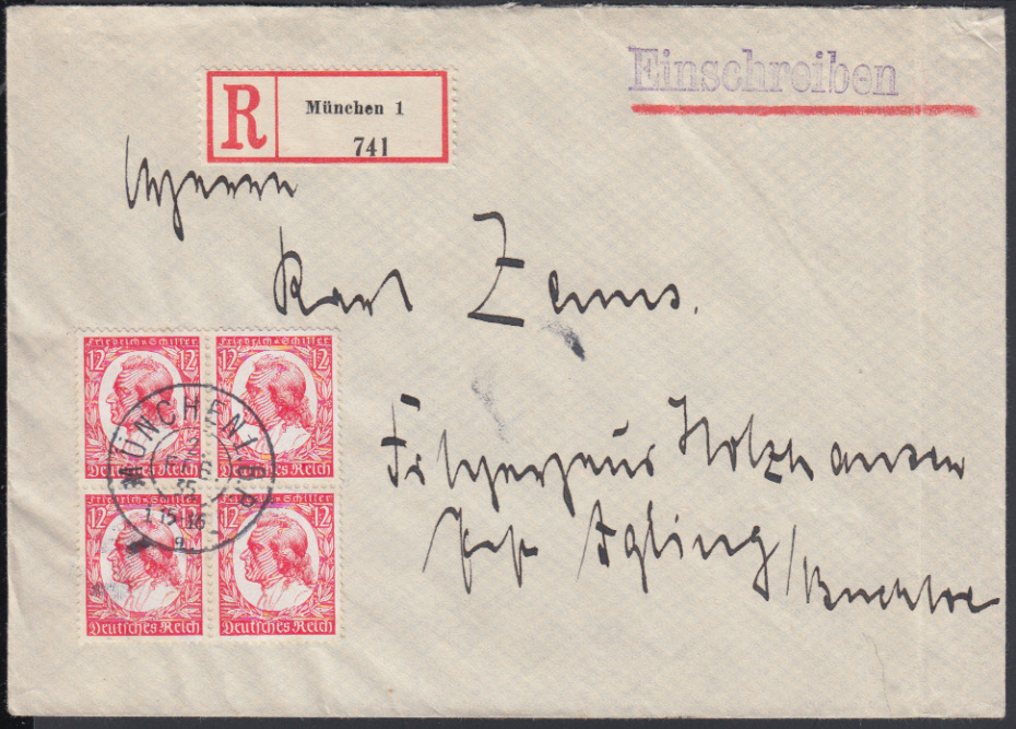 Nr. 38648 - 555 VB - 12 Pf. Schiller 1934, Viererblock mit zentrischem K2 MÜNCHEN 1 B.P. / 2.2.35 auf überfrankiertem Ebf. (Tarif 42 Pf.)