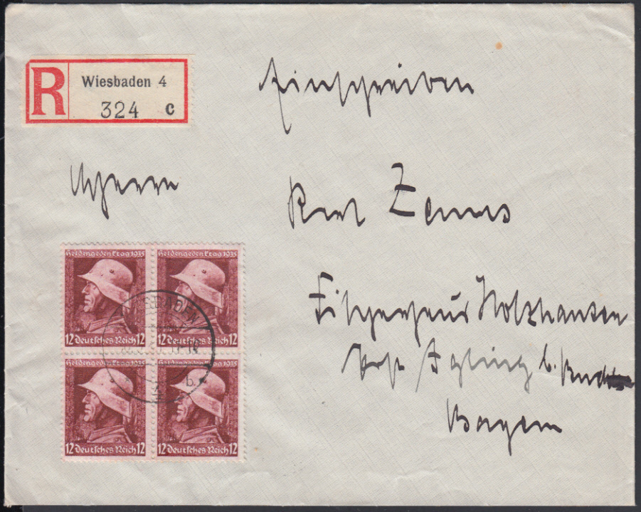 Nr. 38649 - 570 VB - 12 Pf. Heldengedenktag 1935, Viererblock mit zentr. Steg-K1 WIESBADEN 2 / 30.3.35 auf überfrankiertem Ebf. (Tarif 42 Pf.)