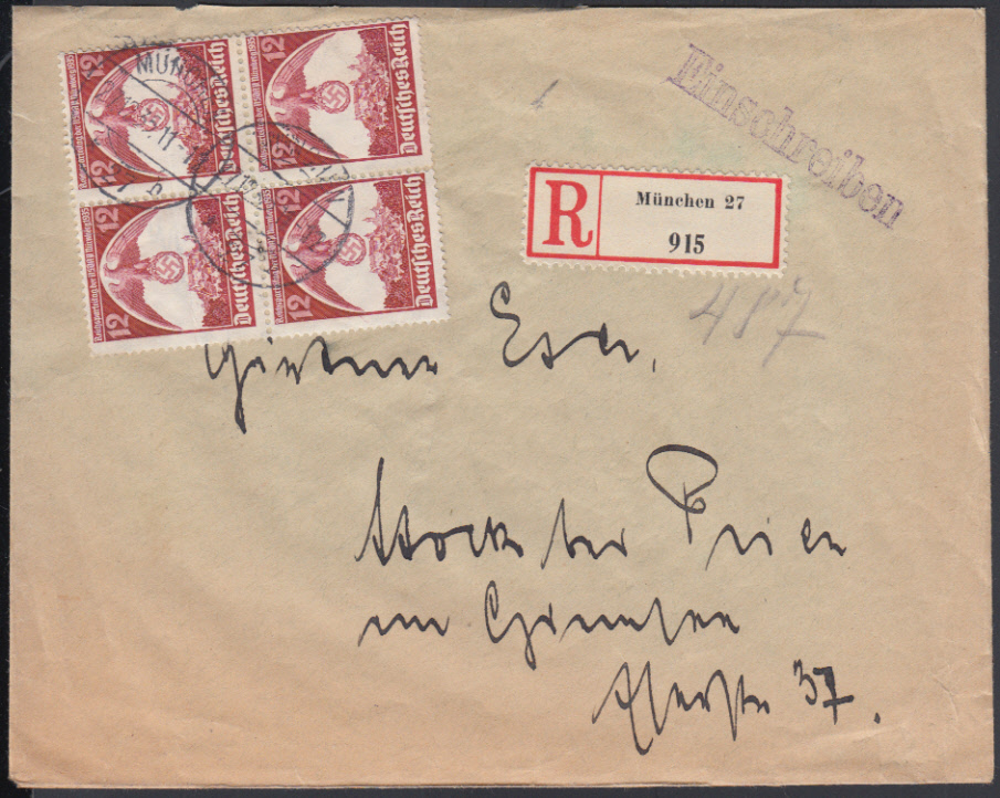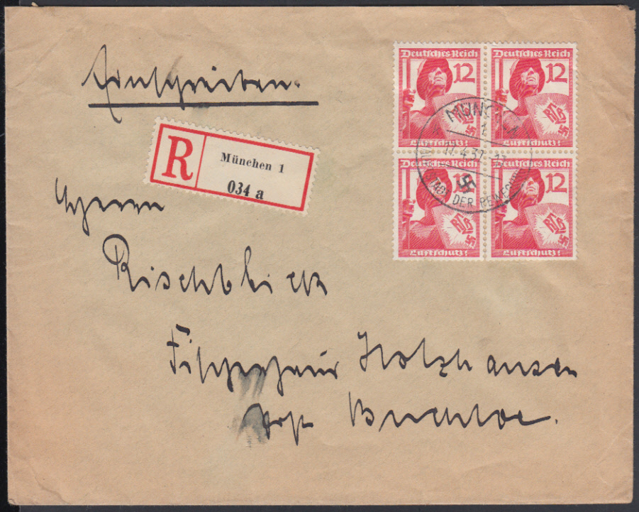 Nr. 38667 - 645 VB - 12 Pf. Luftschutz 1937, Viererblock auf Ebf. mit zentr. K1 MÜNCHEN 1 / 17.4.37 auf überfrankiertem Ebf. (Tarif 42 Pf.)