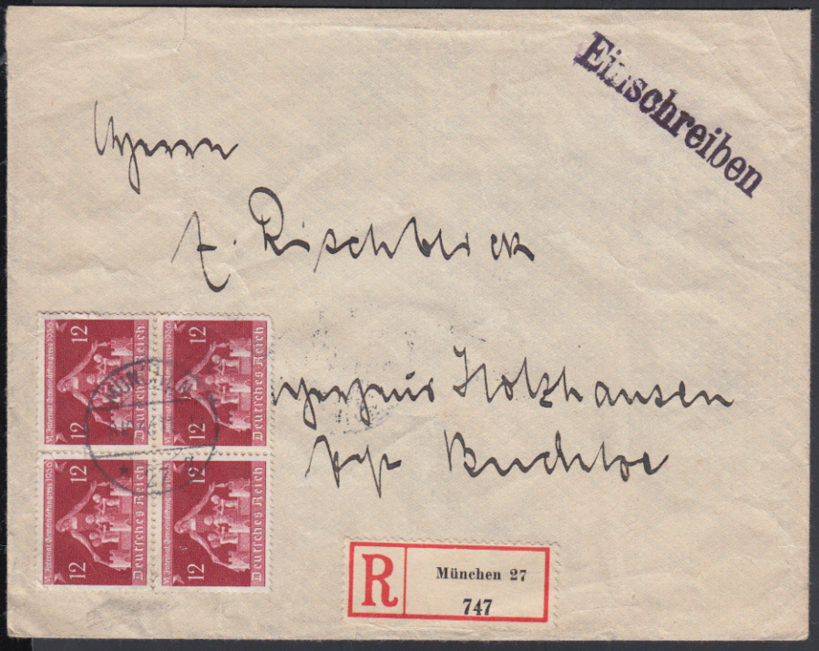 Nr. 38664 - 619 VB - 12 Pf. Gemeindekongreß 1936, Viererblock mit zentr. Steg-K1 MÜNCHEN 27 / 8.10.36 auf überfrankiertem Ebf. (Tarif 42 Pf.)