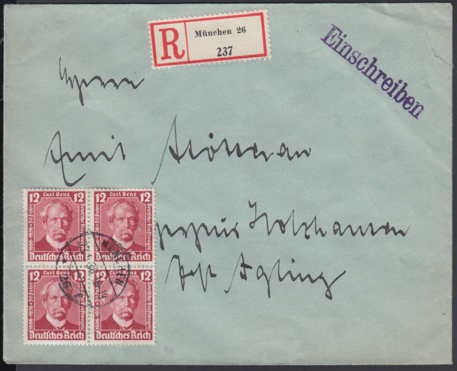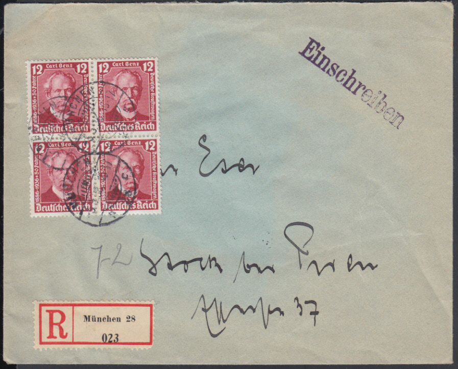 Nr. 38666 - 605 VB - 12 Pf. Carl Benz 1936, Viererblock mit zentr. Steg-K1 MÜNCHEN 26 / 23.5.36 auf überfrankiertem Ebf. (Tarif 42 Pf.)