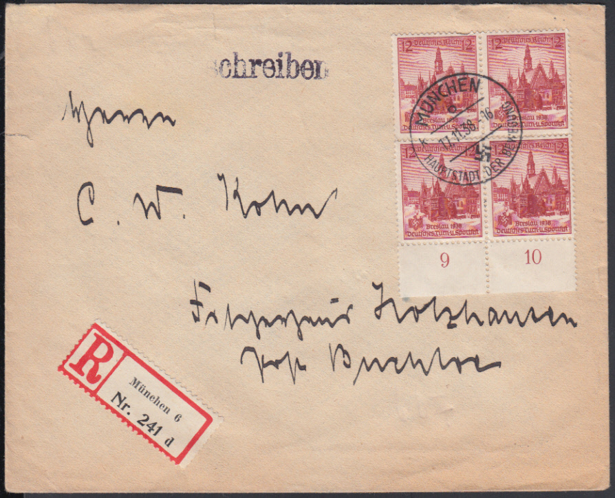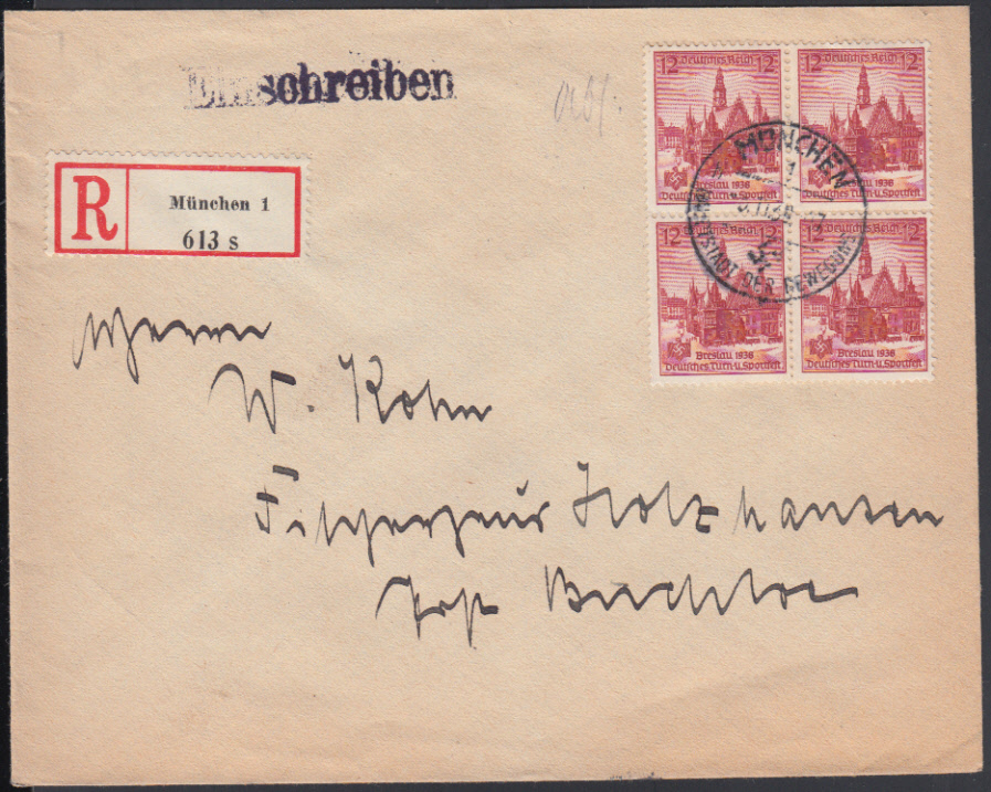 Nr. 38669 - 667 UR-VB - 12 Pf. Turnfest Breslau 1938, Viererblock vom Unterrand mit zentr. K1 MÜNCHEN 1 / 11.11.38 auf überfrankiertem Ebf. (Tarif 42 Pf.)