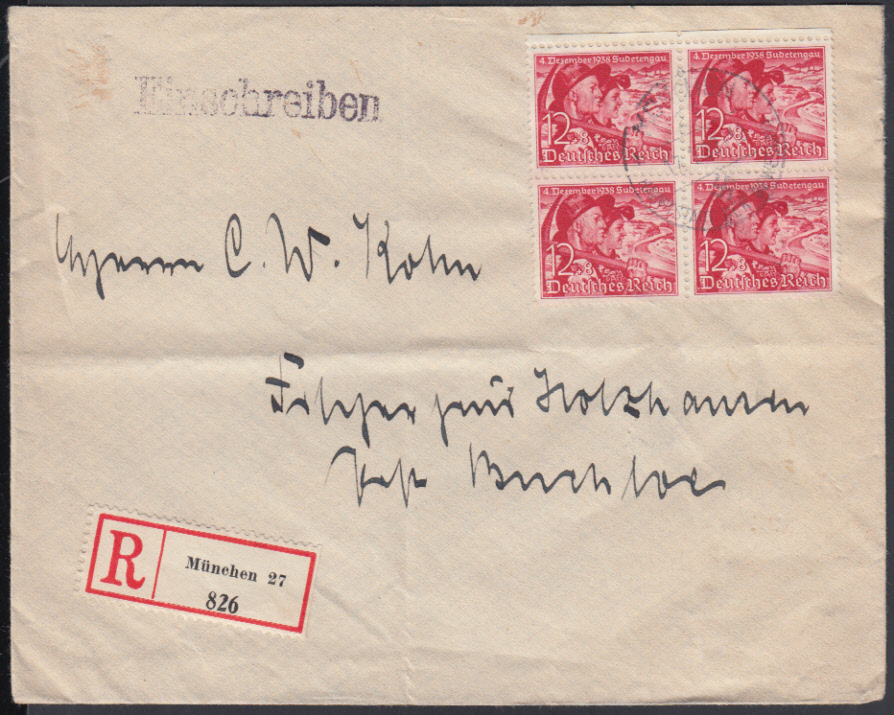Nr. 38670 - 685 VB - 12 Pf. Sudetenland 1938, Viererblock mit zentr. K1 MÜNCHEN 27 / 17.12.38 auf überfrankiertem Ebf. (Tarif 42 Pf.), Umschlag Querbug