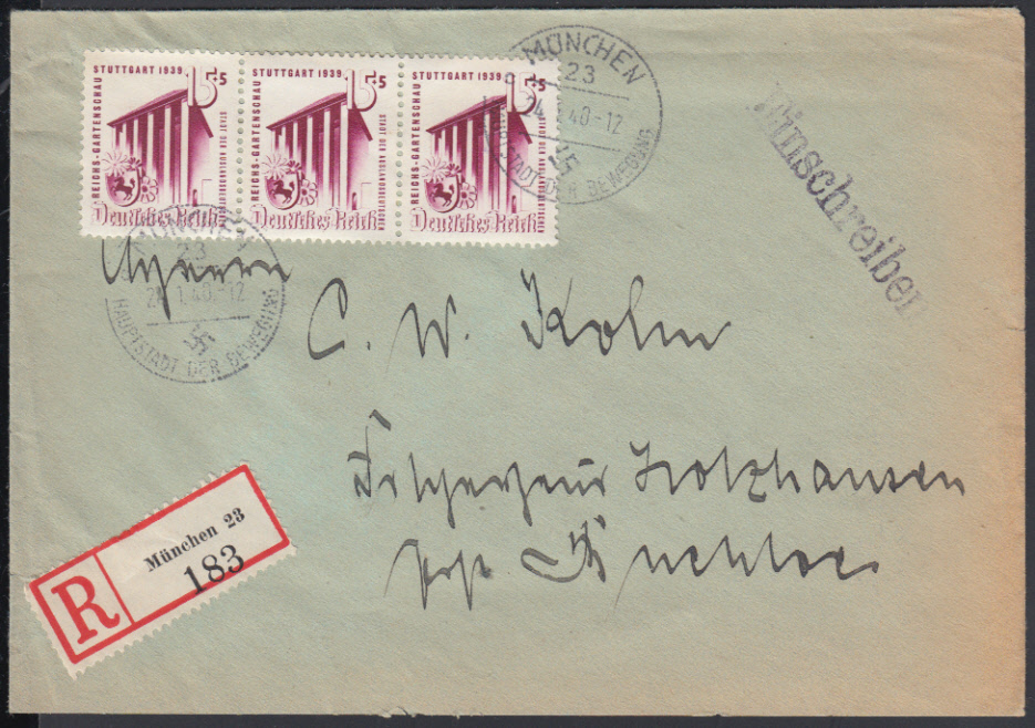 Nr. 38671 - 693 (3) - 15 Pf. Reichsgartenschau Stuttgart 1939, waager. Dreierstreifen ab MÜNCHEN 23 / 24.1.40 auf überfrankiertem Ebf. (Tarif 42 Pf.),