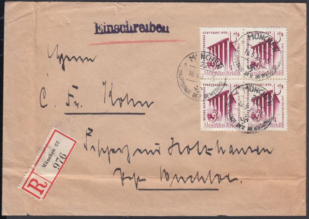 Nr. 38672 - 693 VB - 15 Pf. Reichsgartenschau Stuttgart 1939, Viererblock mit drei K1 MÜNCHEN 22 / 16.5.38 auf überfrankiertem Doppel-Ebf. (Tarif 54 Pf.), Quer- und Längsfaltung außerhalb der Marken