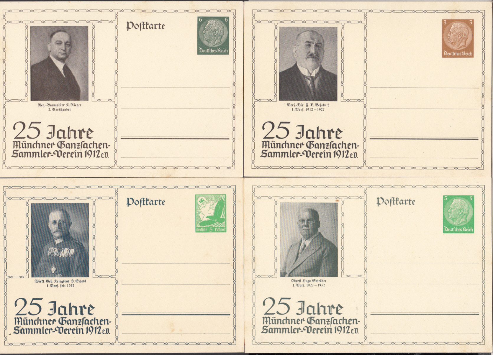 | Nr. 38232 - 4 GA - 25 Jahre Münchner Ganzsachen-Sammler-Verein 1912 e. V., alle 4 ungebr. Privatpostkarten zu 3, 5, 6 Pf. Hindenburg und 5 Pf. Luftpost (PP 122, 126, 127, 142 D) | ||