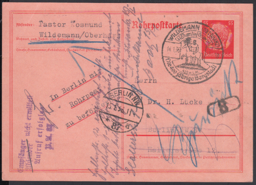 | Nr. 38712 - GARP 25 - 55 Pf. Hindenburg, Rohrpostkarte in nicht häufiger Verwendung als eingehende Post mit Ortswerbestempel WILDEMANN / 14.1.36 nach W 87, Empfänger nicht ermittelbar mit entspr. L4 und retour | ||