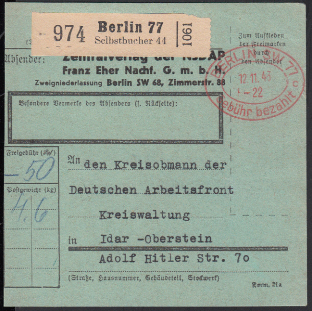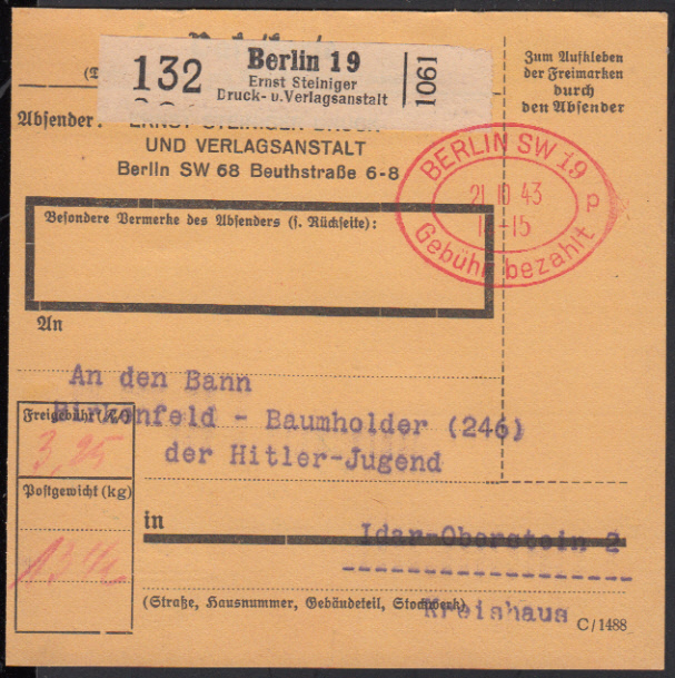 | Nr. 38199 - Pktk - BERLIN SW 19 / 21.10.43, Paketkarten-Postfreistempel Typ Klüssendorf Doppeloval auf Selbstbucher-Paketkarte | ||