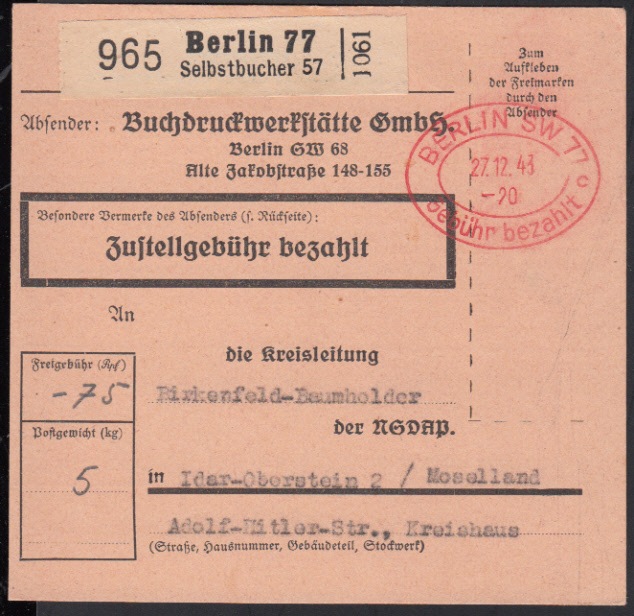 | Nr. 38201 - Pktk - BERLIN SW 77 / 27.12.43, Paketkarten-Postfreistempel Typ Klüssendorf Doppeloval auf Selbstbucher-Paketkarte | ||