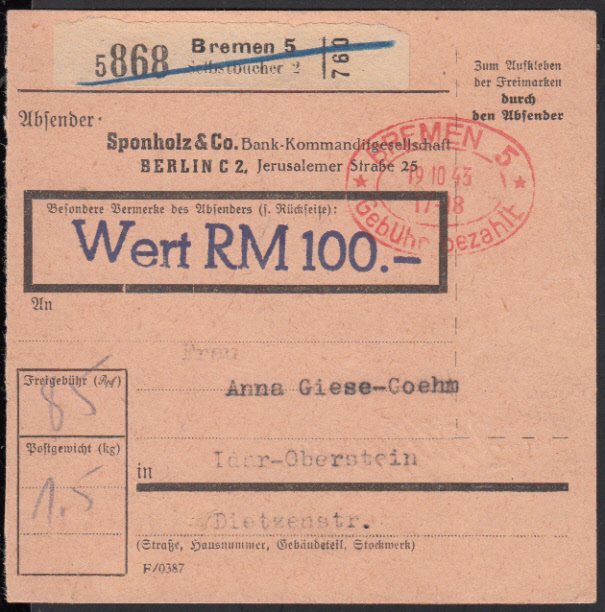 | Nr. 38202 - Pktk - BREMEN 5 / 19.10.43, Paketkarten-Postfreistempel Typ Klüssendorf Doppeloval auf Selbstbucher-Wertpaketkarte | ||