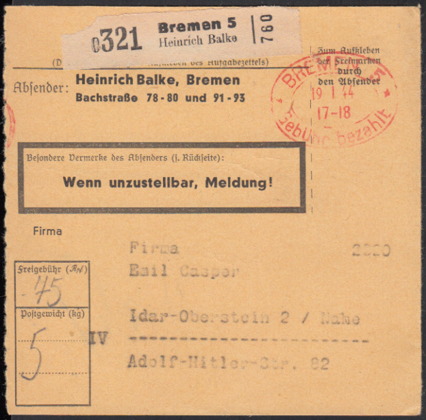 | Nr. 38203 - Pktk - BREMEN 5 / 19.1.44, Paketkarten-Postfreistempel Typ Klüssendorf Doppeloval auf Selbstbucher-Paketkarte | ||