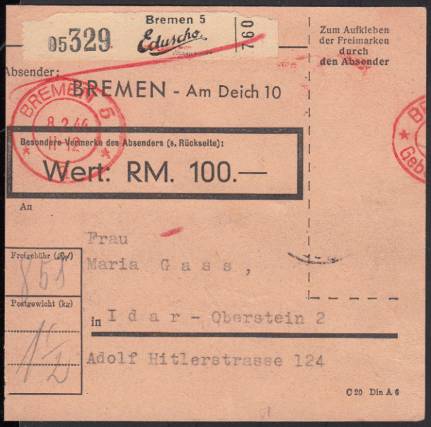 | Nr. 38204 - Pktk - BREMEN 5 / 8.2.44, Paketkarten-Postfreistempel Typ Klüssendorf Doppeloval auf Selbstbucher-Wertpaketkarte "Eduscho" mit hauptsächlichem Abschlag des K2 des Einlieferungsabschnittes | ||