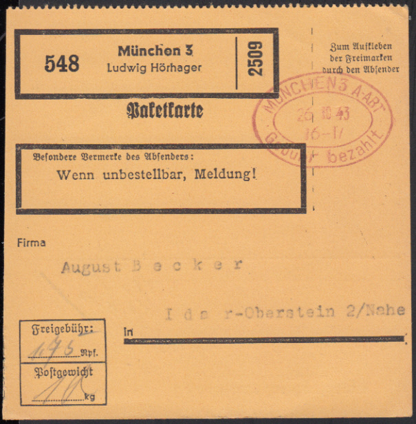 | Nr. 38205 - Pktk - MÜNCHEN 3 A-ABT / 26.10.43, Paketkarten-Postfreistempel Typ Klüssendorf Doppeloval auf Selbstbucher-Paketkarte | ||