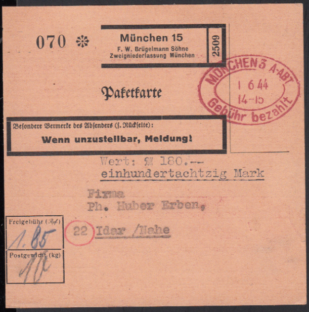 | Nr. 38207 - Pktk - MÜNCHEN 3 A-ABT / 1.6.44, Paketkarten-Postfreistempel Typ Klüssendorf Doppeloval auf Selbstbucher-Paketkarte, zusätzlich rs. zweiter Abschlag des vollständigen Stempels | ||
