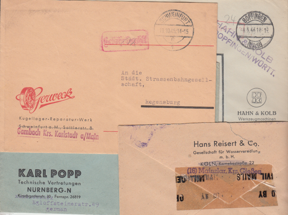 Nr. 38223 - (4) - Ausgelagerte Firmen : 4 Briefe 1945/46 mit Geb.-Bez.-Vermerken aus Gambach (ex Schweinfurt), Lollar (ex Köln), Bopfingen (ex Stuttgart) und Nürnberg (mit neuer Anschrift)
