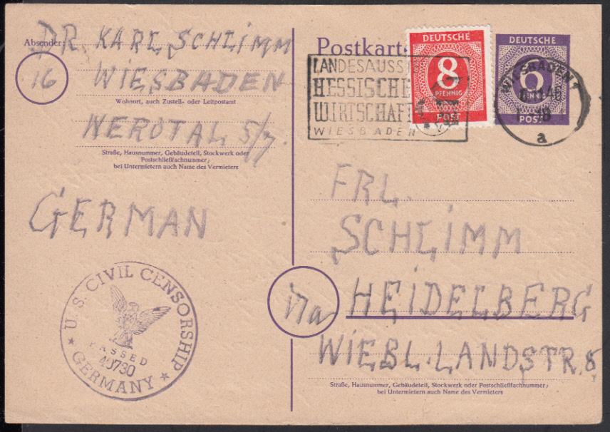 Nr. 38127 - GAP 951, 917 - WIESBADEN 1 / 6.11.46, Maschinen-Halbstempel "Landesausstellung Hessische Wirtschaft Wiesbaden" auf GA 6 Pf. Ziffer mit Zusatz 8 Pf. und amer. Zensur 40730 (Esslingen) nach Heidelberg