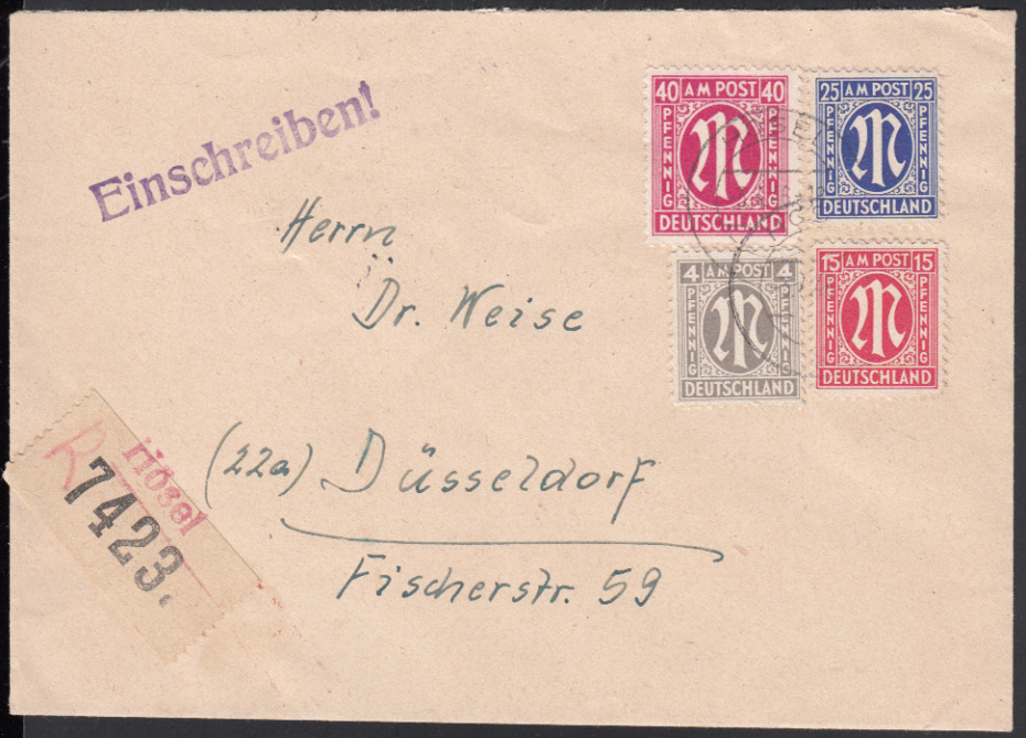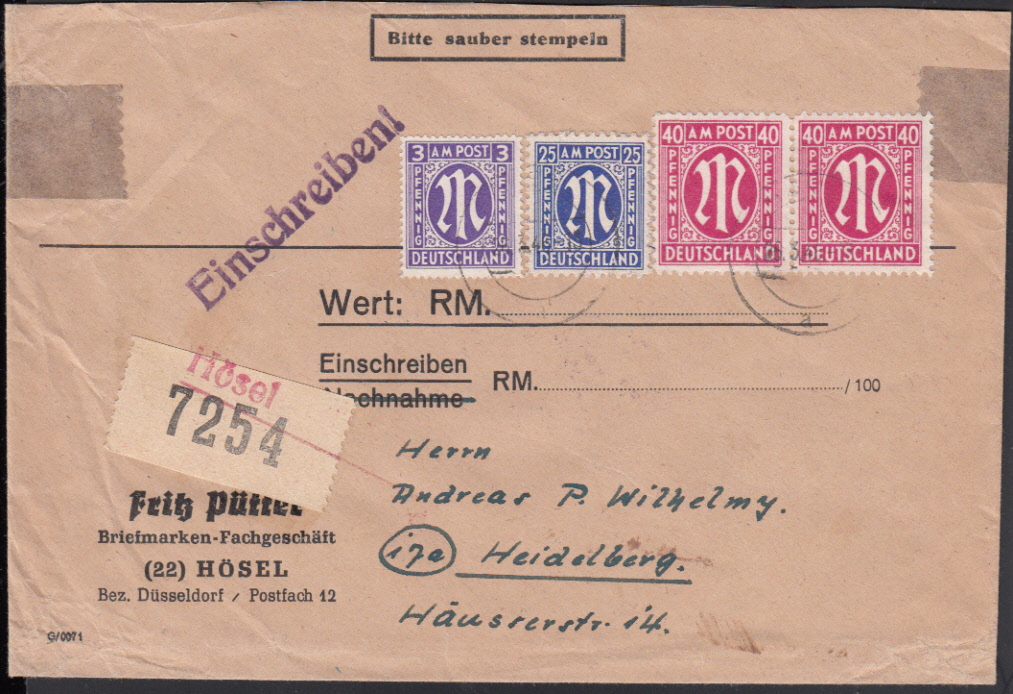 Nr. 38083 - 2, 8, 9, 30 - HÖSEL / 3.4.46, portorichtiger Ebf. mit 4, 15, 25 und 40 Pf. AM-Post sowie Billett-Nummernzettzel "7423" mit rotem L1 "Hösel" als Ersatz für Einschreibzettel, Notmassnahme des PA Ratingen