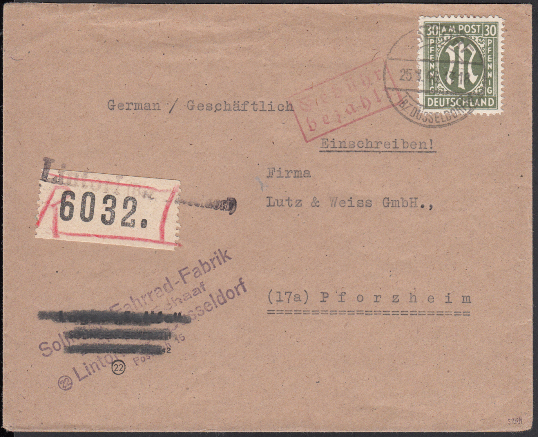 Nr. 38086 - 29 - LINTORF (BZ. DÜSSELDORF) / 25.1.46, Ebf. mit 30 Pf. AM-Post in Teilbarfrankatur mit rotem R2 "Gebühr bezahlt" sowie Billett-Zettel "6032" mit schwarzem L1 "Lintorf" als Ersatz für Einschreibzettel,