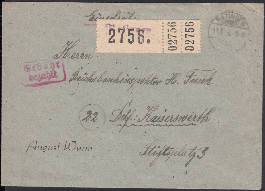 Nr. 38087 - - RATINGEN / 11.3.46, Ebf. mit rotem R2 "Gebühr bezahlt" sowie Billett-Nummernzettzel "2756" mit violettem L1 "Ratingen" und zwei noch anhängenden Abrissnummern, sehr dekorativ