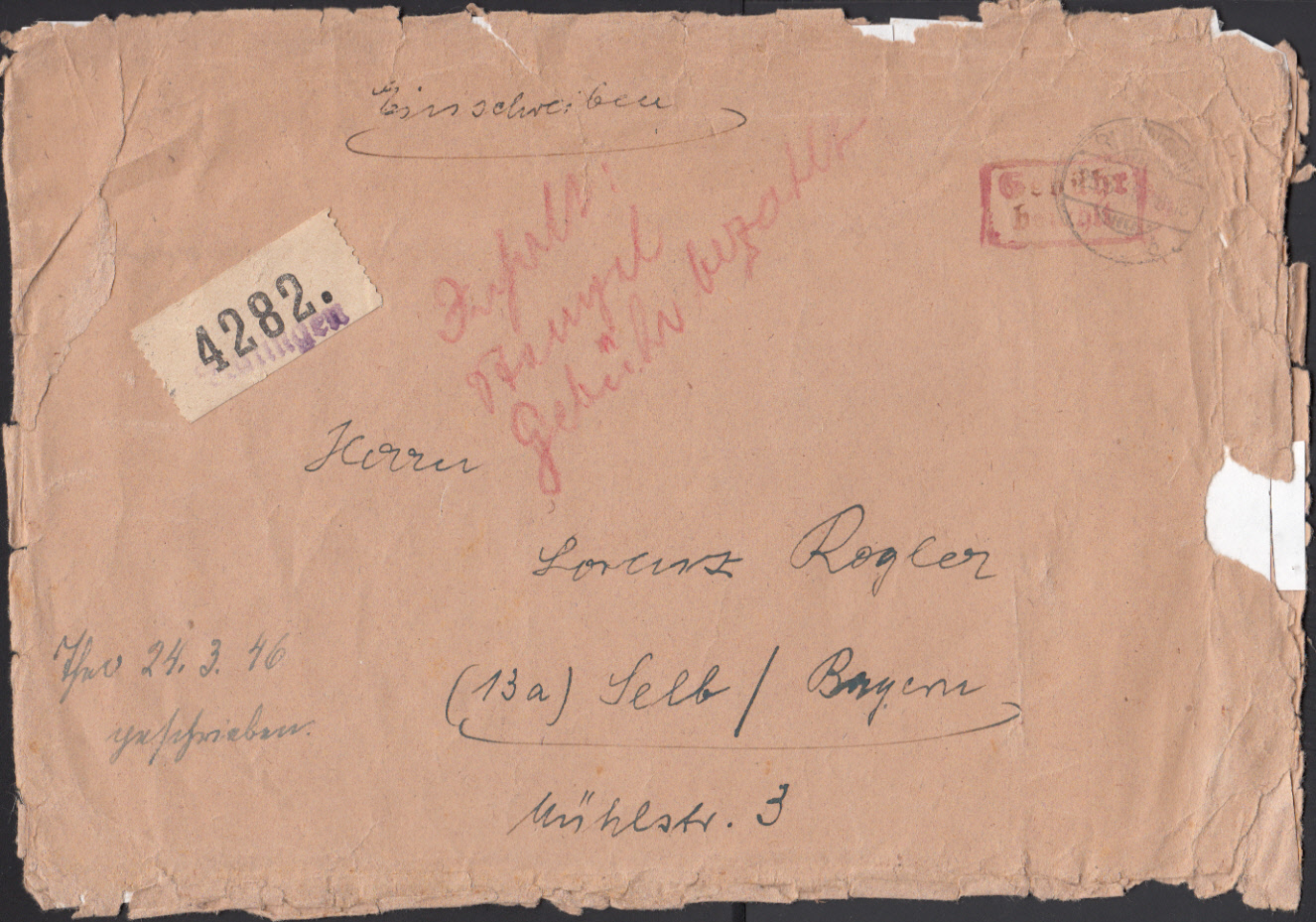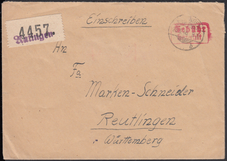 Nr. 38091 - - RATINGEN / 25.3.46, großformatiger Ebf. (23 x 16 cm) mit rotem R2 "Gebühr bezahlt" sowie Billett-Nummernzettzel "4282" mit viol. L1 "Ratingen", erhebliche Randmängel