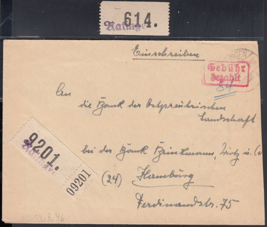 Nr. 38089 - - RATINGEN / 14.3.46 (?), Ebf. mit rotem R2 "Gebühr bezahlt" sowie Billett-Nummernzettzel "9201" mit violettem L1 "Ratingen", beigegeben entsprechender loser Zettel mit "614"