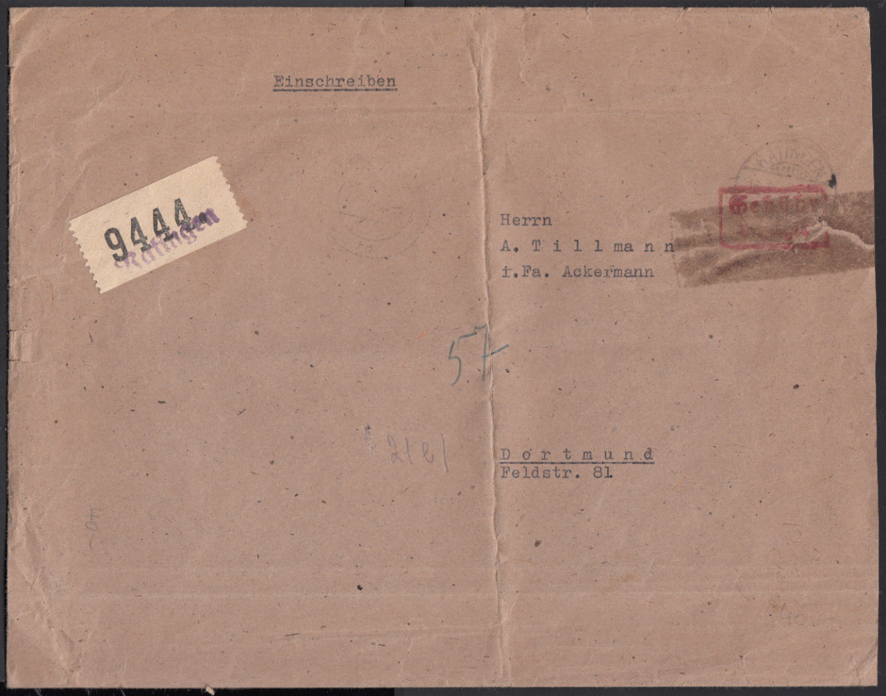 Nr. 38090 - - RATINGEN / 26.3.46, großformatiger Ebf. (22 x 17 cm) mit rotem R2 "Gebühr bezahlt" sowie Billett-Nummernzettzel "9444" mit viol. L1 "Ratingen", mittels Tesa verklebter Riß und Mittelfaltung