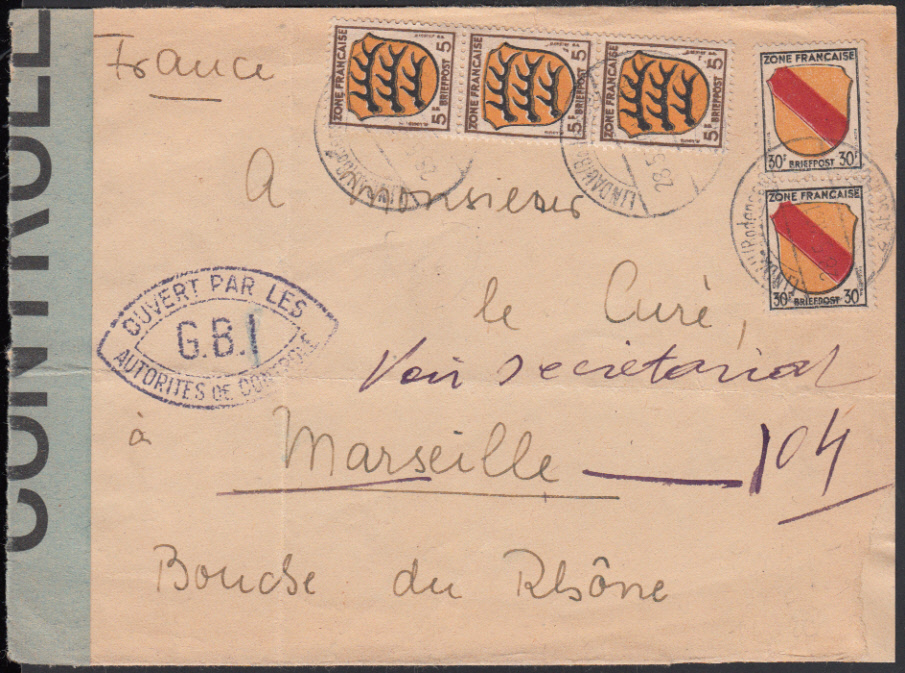 Nr. 20897 - ex 1/10 - G.B.C., Spitzoval-Zensurstempel beidseitig auf portor. Auslandsbrief mit Ortswerbestempel LANGENARGEN / 15.6.46 und 1, 3, 5, 12, 24 und 30 Pf. Wappen (total 75 Pf.) nach Zürich