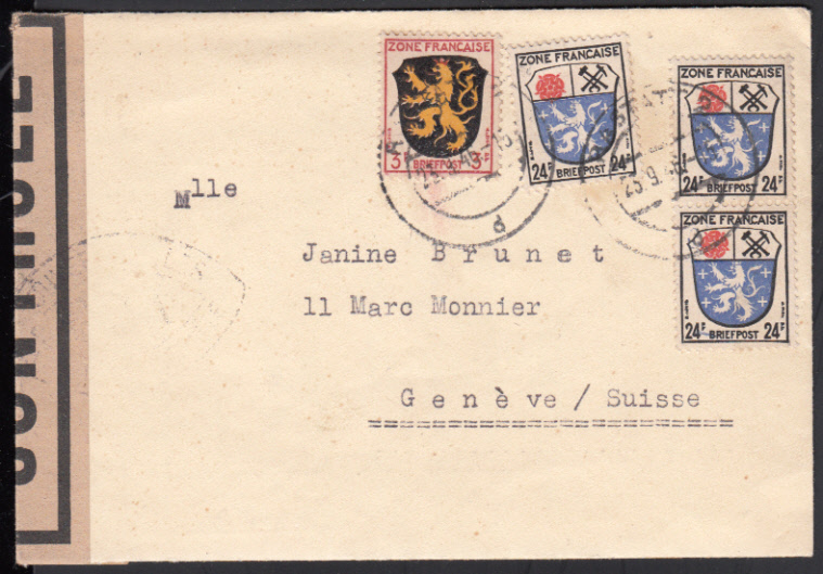 Nr. 38116 - 2, 9 (3) - G.B.A., Spitzoval-Zensurstempel (Riemer F-11; Zensor 304) sehr zart beidseitig auf Brief mit 3 und 3 x 24 Pf. Wappen ab RASTATT 2 / 23.9.46 nach Genf /CH, Inhalt unzensiert inliegend