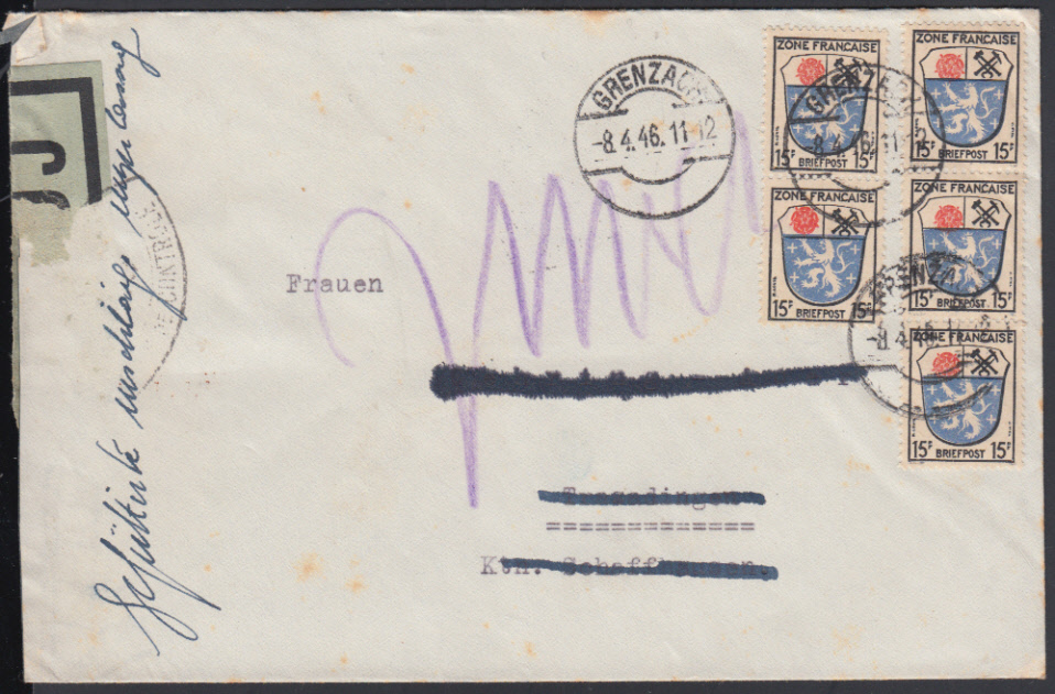 Nr. 38437 - 7 (5) - G.B.C., Spitzoval-Zensurstempel beids. auf grünem Verschlußstreifen auf Brief mit 5 x 15 Pf. Wappen ab GRENZACH / 8.4.46 in die CH und zurück, hschr. "Gefütterté umschläge unzulässig", Kurzbef. Wehner BPP