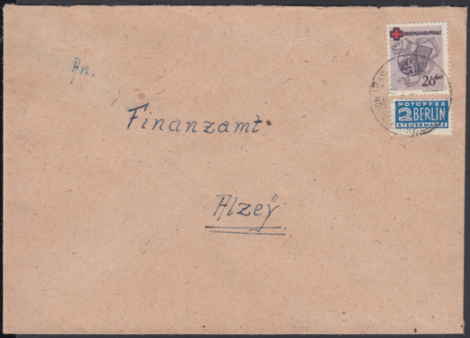 Nr. 38645 - 43 - 20 Pf. Rotes Kreuz mit NOB einzeln auf Bedarfsbrief mit zartem K2 WONSHEIM / über SPRENDLINGEN (RHEINHESS) / 26.8.49 nach Alzey (Mi. 200 €)