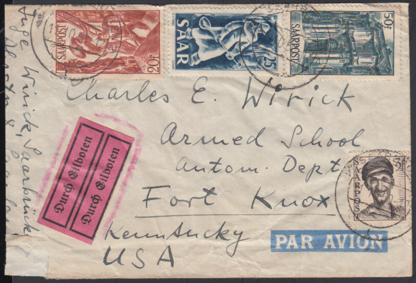 Nr. 37209 - 287,319,326 - SAARBRÜCKEN 10 / 22.5.56 (SHB 14), Bedarfs-Luftpost- Eilbrief eines franz. Gendarmen nach Berlin (Tarif 73 Fr.) mit 60 Fr. Saar IV und 1 und 12 F. Saar V (Götz 1300)