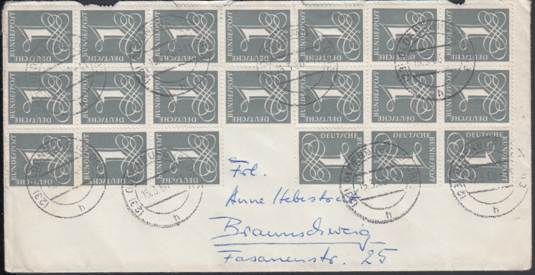 Nr. 38395 - 226 x (20) - 1 Pf. Ziffer auf nicht fluoreszierendem Papier, 20 Stück teils in Einheiten auf Fernbrief ab OLDENBURG (OLDB) 3 / 15.3.60, Umschlag mit Öffnungsmängeln