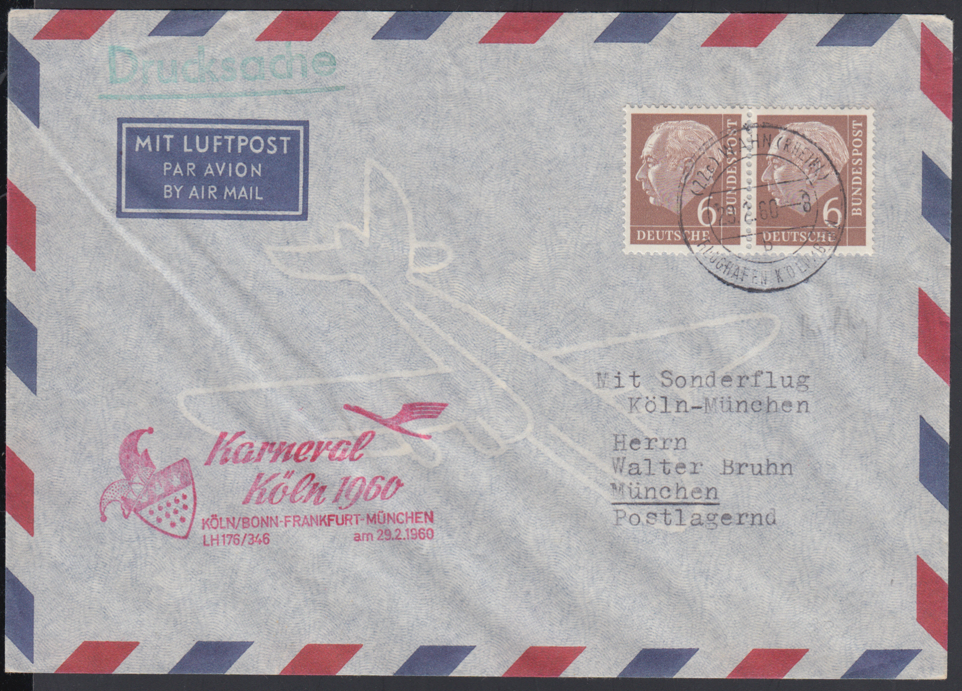 Nr. 38564 - 180 (2) - 6 Pf. Heuss, waager. Paar auf portor. Drucksache per Luftpost (7 + 5 Pf.) ab WAHN (RHEINL) / FLUGHAFEN KÖLN-BONN / 29.2.60 nach München und retour; philatelistisch, aber selten