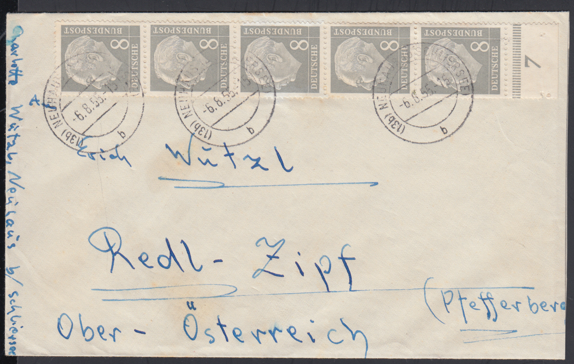 Nr. 38565 - 182 (5) - 8 Pf. Heuss, senkr. Fünferstreifen auf portor. Auslandsbrief ab NEUHAUS (SCHLIERSEE) / 6.6.55 nach Österreich