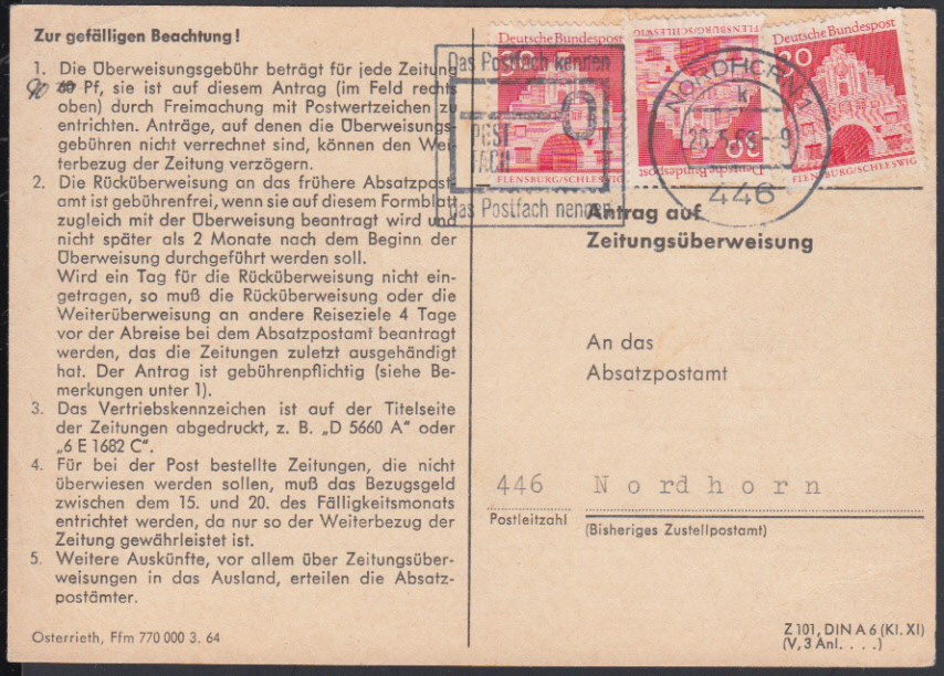 | Nr. 38551 - Kte493 (3) - NORDHORN / 26.5.68, Maschinenstempel auf "Antrag auf Zeitungsüberweisung" portorichtig mit 3 x 30 Pf. Große Bauwerke rot | ||