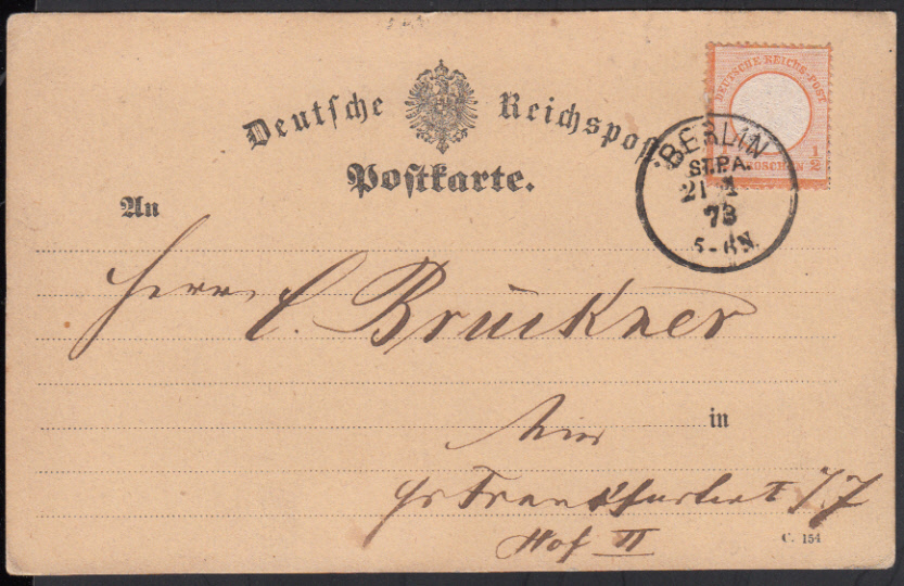 Nr. 38117 - KteKBHW 47 - BERLIN / ST.PA. / 21.1.73, klarer K1 (KBHW 73) auf 1 Gr. Großer Brustschild (Mi. 18) auf Postkarten-Formular Frech Nr. 23 als Ortskarte