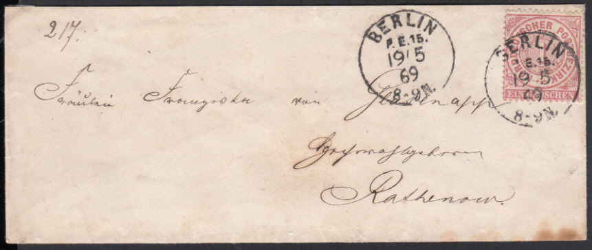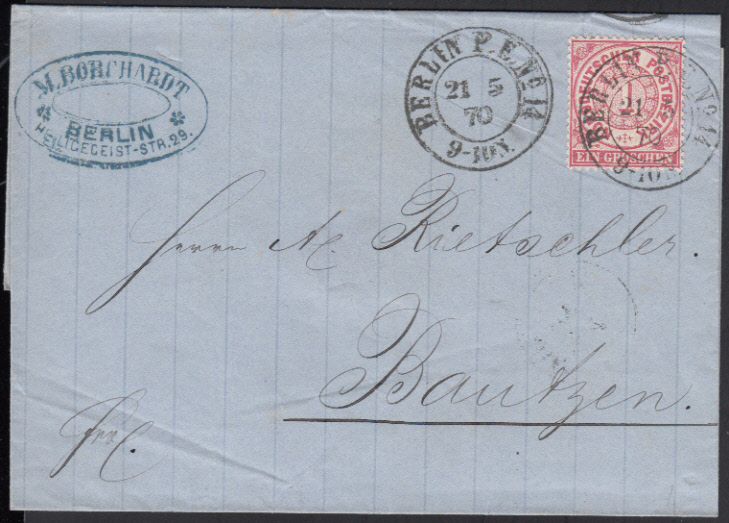 Nr. 38118 - KBHW 402b - BERLIN P. E. No 14 / 21.5.70, zwei schwarze K2 (Schrift Antiqua, "4" offen - KBHW 402b) auf Brief mit NDP 1 Gr. gezähnt