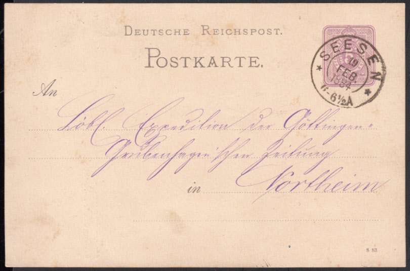 Nr. 38224 - GAP 12 - SEESEN / 19 FEB 1884, sehr klarer Nachverwender-K2 in später Verwendung (für Pfg. nicht gelistet) auf GA 5 Pfg.