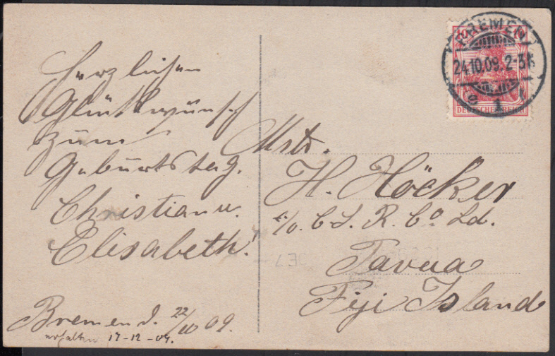 Nr. 38124 - AK86 I - BREMEN 1 / 24.10.09, Glückwunsch-AK mit 10 Pf. Germania nach Tavua auf den Fiji-Inseln, schwacher Ankunftsstempel "1909 DE 7", handschr. "erhalten 17-12-09", seltene Destination
