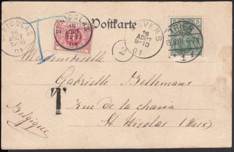 Nr. 38125 - AK55, B P 8Ia - TRIER 1 / 15.8.01, 5 Pf. Germania Reichspost auf AK Trier nach Belgien, dort mit Portomarke 10 C. mit K1 ST. NICOLAS / 16 AOUT 01