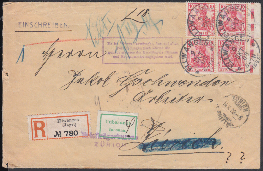 Nr. 38430 - 86 I VB - ELLWANGEN / 9.10.08, 10 Pf. Germania als VB vom rechten Rand auf Ebf. nach Zürich, von dort mit viol. L2 "Briefträgerbureau / ZÜRICH" und viol. R4 "Es ist dringend erwünscht, ..." wieder zurück, Eingang 15.10.08